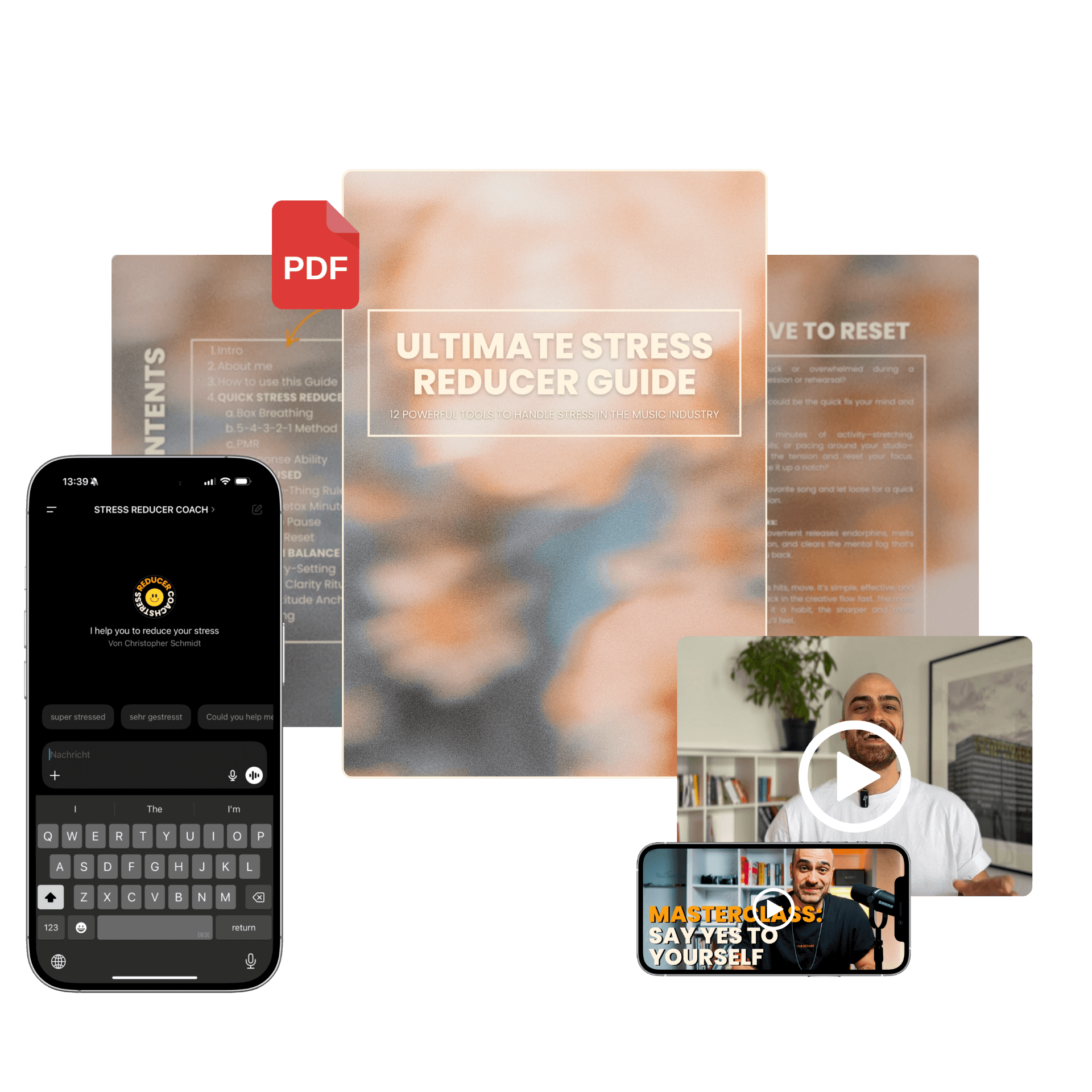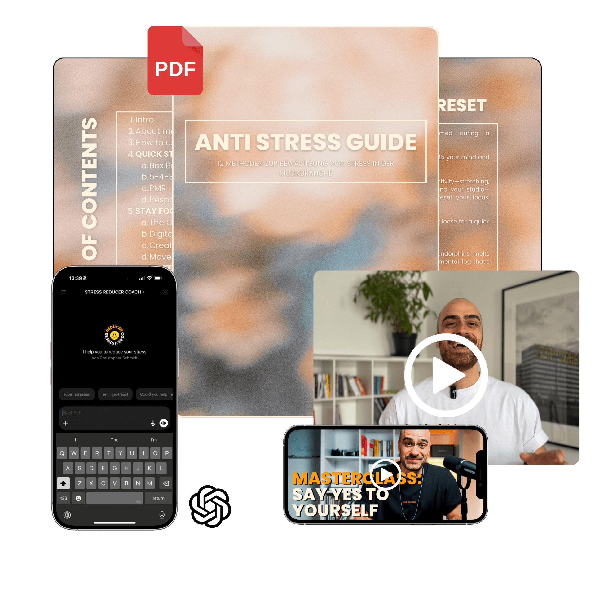 Exklusiver Bonus: Der Anti-Stress-Guide mit einem persönlichen Stress-Reducer-GPT-Coach und einer exklusiven Masterclass, die dir zeigt, wie du im Musikbusiness selbstbewusst „Nein“ sagst (im Wert von 250 €).